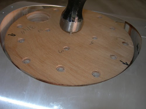 With that out of the way, I returned to the frame, to fix the goof I made yesterday when drilling the hole for the gas pipe. Recall that I accidentally drilled a 1.00" hole on one side of the frame, when I should have drilled a 1.25" hole. After considering various options for fixing the problem, I decided to use a scrap piece of plywood and drill a 1.25" hole in it. Then, I carefully lined up the center of the 1.25" diameter hole in the scrap wood, with the center of the 1.00" hole in the frame.